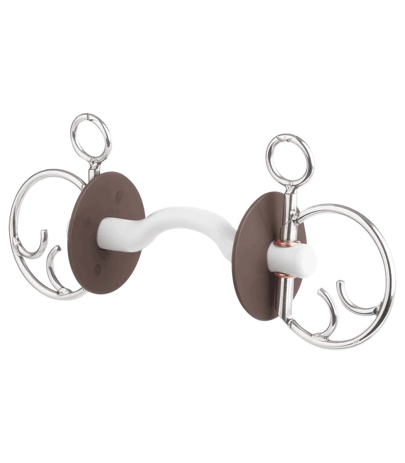 The tongue port bar has an especially flattened shape to the port. This gives the tongue optimum room. Many horses respond to this with improved suppleness and increased chewing. This bit is also very well suited to horses that play with their tongues, trying to get their tongue over the bit. won’t tolerate pressure on the tongue and for those who tend to stick their tongue above the bit as the port effectively prevents this. With a height of 30 mm the port is fully permissible under German equestrian sport regulations. This mouthpiece is thus eminently suited to horses that do not tolerate traditionally shaped bits due to the pressure on the tongue and react by head-shaking and the like. The Kimblewick bit is an effective combination of a lever effect on the horse‘s lower jaw, pressure on the poll and change of position inside the horse‘s mouth. Three different buckling options allow the bit to be fine tuned. The sturdy side pieces of the bit provide a certain weight, which ensures a steadier position in the mouth.