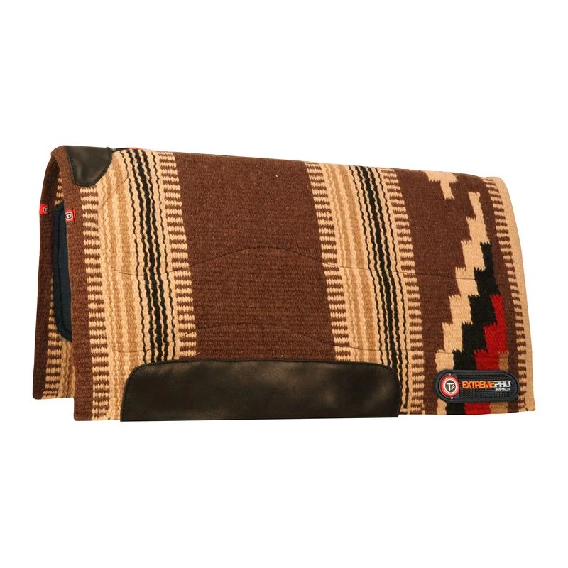 This traditional looking Western saddle pad features full length Extreme Pro Impact inserts that shield against shock. The inserts are encased in a high quality woven wool saddle blanket with compression resistant orthopedic grade black polyester felt lining. The lining is cutout for optimal contouring to the horse’s wither and spine. There are genuine leather wear leathers, as well as cut outs for correctly placed leg. Note – the inserts are NOT removable.